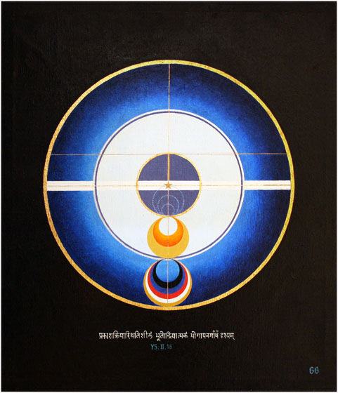Klasyczna joga przyjmuje istnienie stanu nieprzejawionej rzeczywistości. Stan ten zwie się alinga i jest podstawą /pradhana/ całej przejawionej rzeczywistości przedmiotowej. Jako podstawa charakteryzuje się on najwyższą formą subtelności. Jest też alinga właściwym przedmiotem poznania dla widza uniwersalnego /Iśwary/ i może się ujawnić na terenie najczystszej świadomości /lingi/, której jest przyczyną i względem której jest transcendentna. Twierdzi się też, że alinga istnieje i nie istnieje. Istnieje ona wtedy, gdy jest przedmiotem doznania Iśwary. Występuje to w momencie /w atomie czasu/, w którym jest zawarta cała rzeczywistość. W Jogasutrach twierdzi się, że z tej formy poznania /sabidżasamadhi/ wyrasta drzewo świata. Nie istnieje natomiast alinga, jeśli jej punktem odniesienia jest podmiot absolutny /purusza/. Spełniła ona bowiem względem niego swoje zadanie i jako twór składający się z gun stała się pusta /doszła do kresu własnego rozwoju/. Praca przedstawia za pomocą symboli alingę, jej stosunek do widza zjawiskowego, puruszy i różne jej funkcje. Alingę wyraża fioletowe koło. W centrum koła gwiazda symbolizuje widza zjawiskowego Iśwarę. Dwie linie wychodzące z punktu centralnego, krzyżujące się pod kątem prostym wyrażają jedyność i absolutność puruszy. Złota obwódka otaczająca fioletowe koło wyraża transcendentność puruszy względem alingi. Linia prosta oddzielająca złotą obwódkę od fioletowego koła wyraża akt widzenia rozróżniającego, który wiedzie do poznania całej rzeczywistości przedmiotowej. Wyraża to biała obwódka otaczająca z obu stron linię poziomą, wychodzącą z centralnego punktu. Koło bladoniebieskie otaczające centrum wyraża lingę /czystą świadomość/. W lindze ma miejsce ewolucja elementów subtelnych i indryjów /psychicznych organów działania i poznania/. Przerywane linie koliste w alindze wskazują, że jest ona zasadą twórczą względem lingi. Fioletowy obwód lingi wskazuje na jej immanentny charakter względem alingi. Obwód srebrny to sfera manasu. Ostatnie pięć okręgów rozwijających się na niebieskim polu oznacza mahabhuta /wielkie elementy/, które są zasadami dla różnych form rzeczywistości danej w naoczności zmysłowo-intelektualnej. |